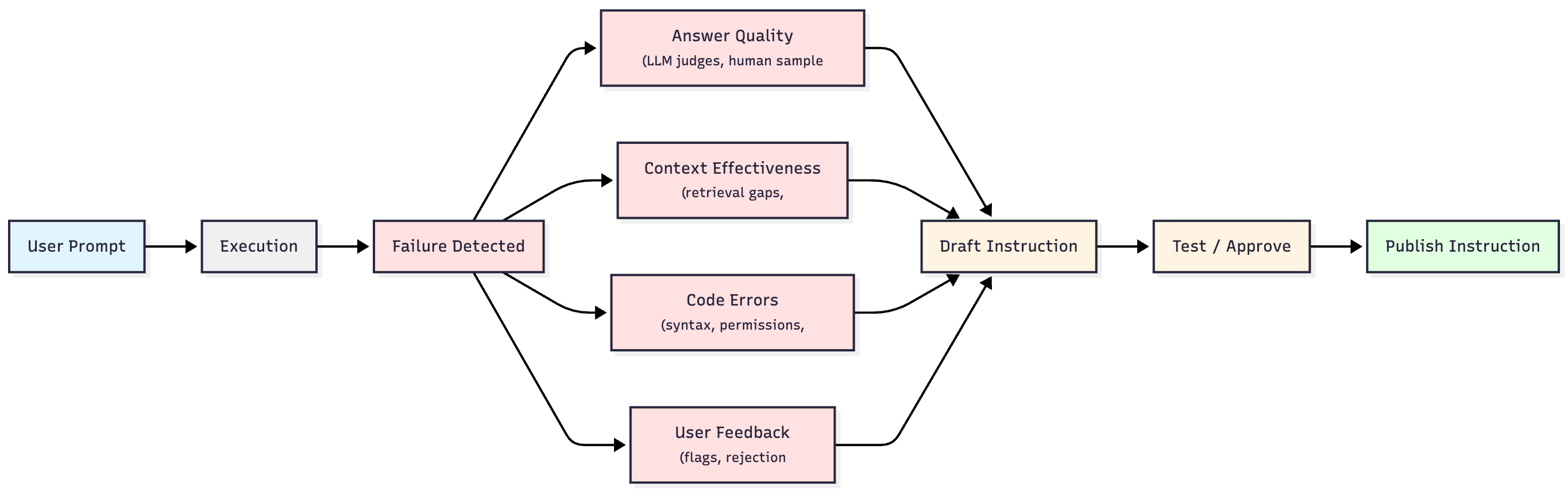 Think of this as unit testing for AI outputs. You wouldn’t ship code without tests—why ship answers without validation? The difference is that your tests evolve: what fails today becomes tomorrow’s regression test, encoded as instructions that prevent the same failure from happening again.